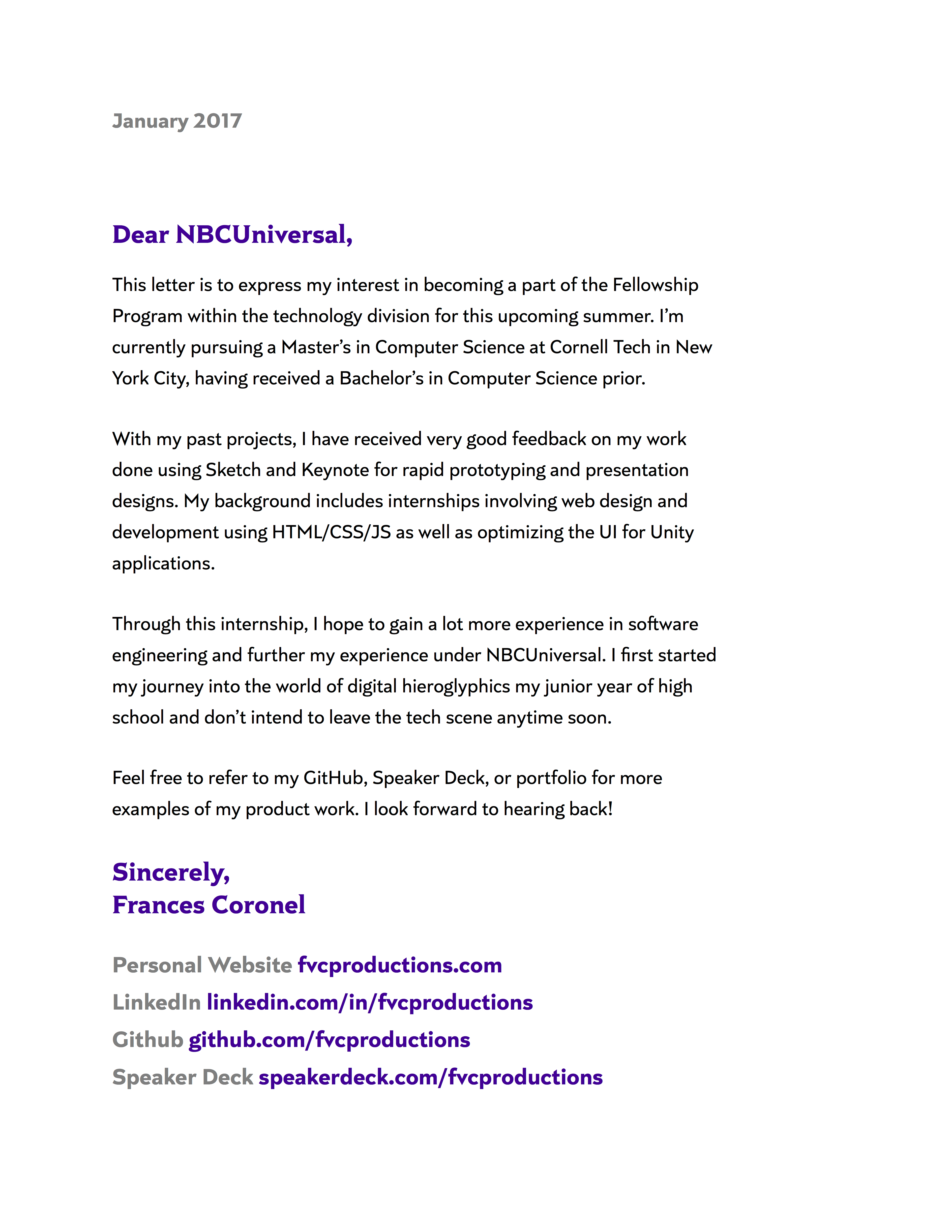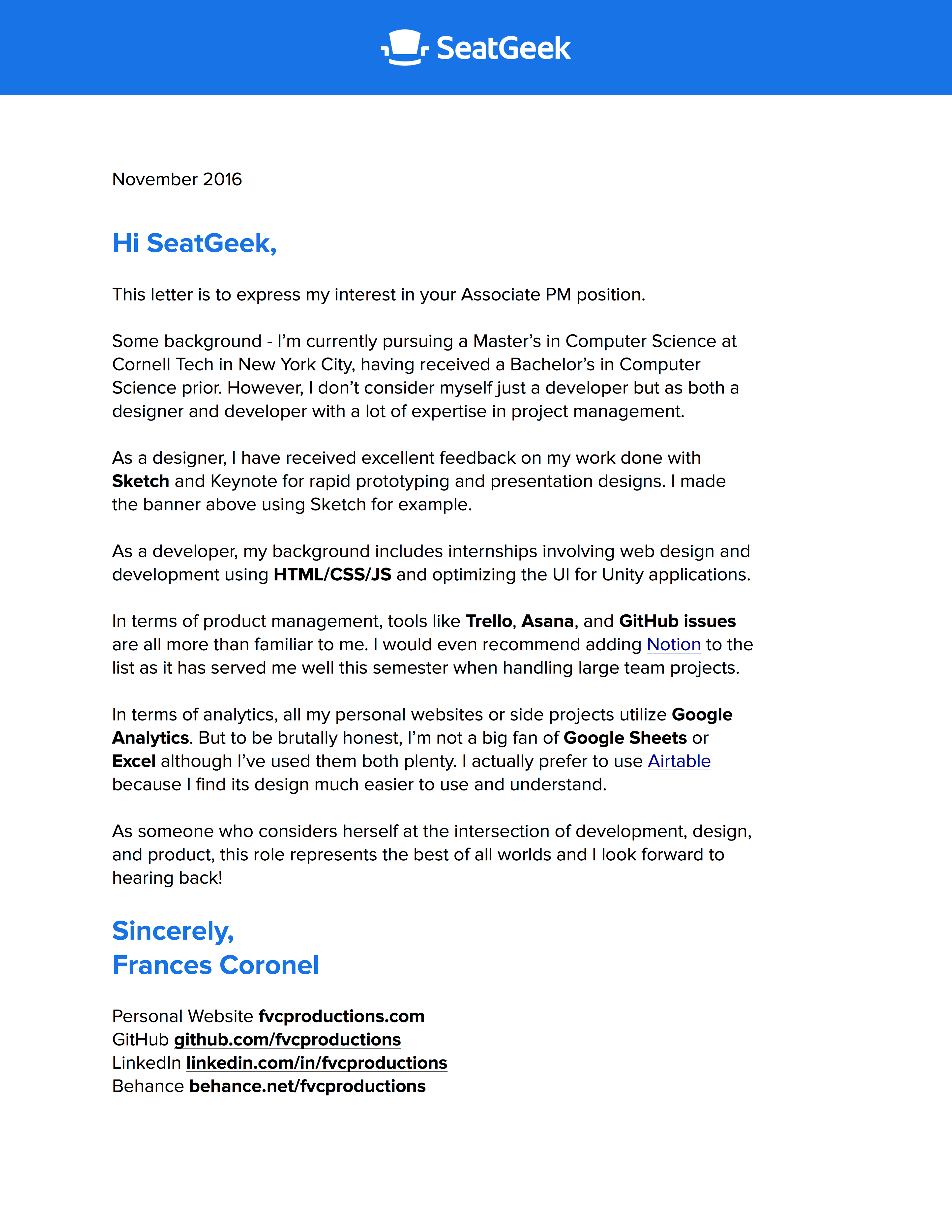 I created 5 different cover letter templates for 5 different companies: Braintree, IDEO, Meetup, NBCUniversal, and SeatGeek. I created these while I was in the process of applying for jobs at these places. The cover letters have been sanitized to remove any meaningful personal information. These templates are free for anyone to use and modify by downloading the Pages files from my GitHub.