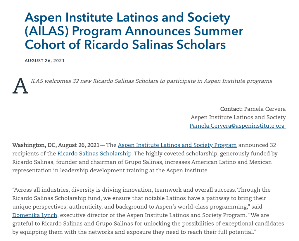 For my leadership work with Techqueria, I was awarded the Ricardo Salinas scholarship to attend the Aspen Executive Seminar.