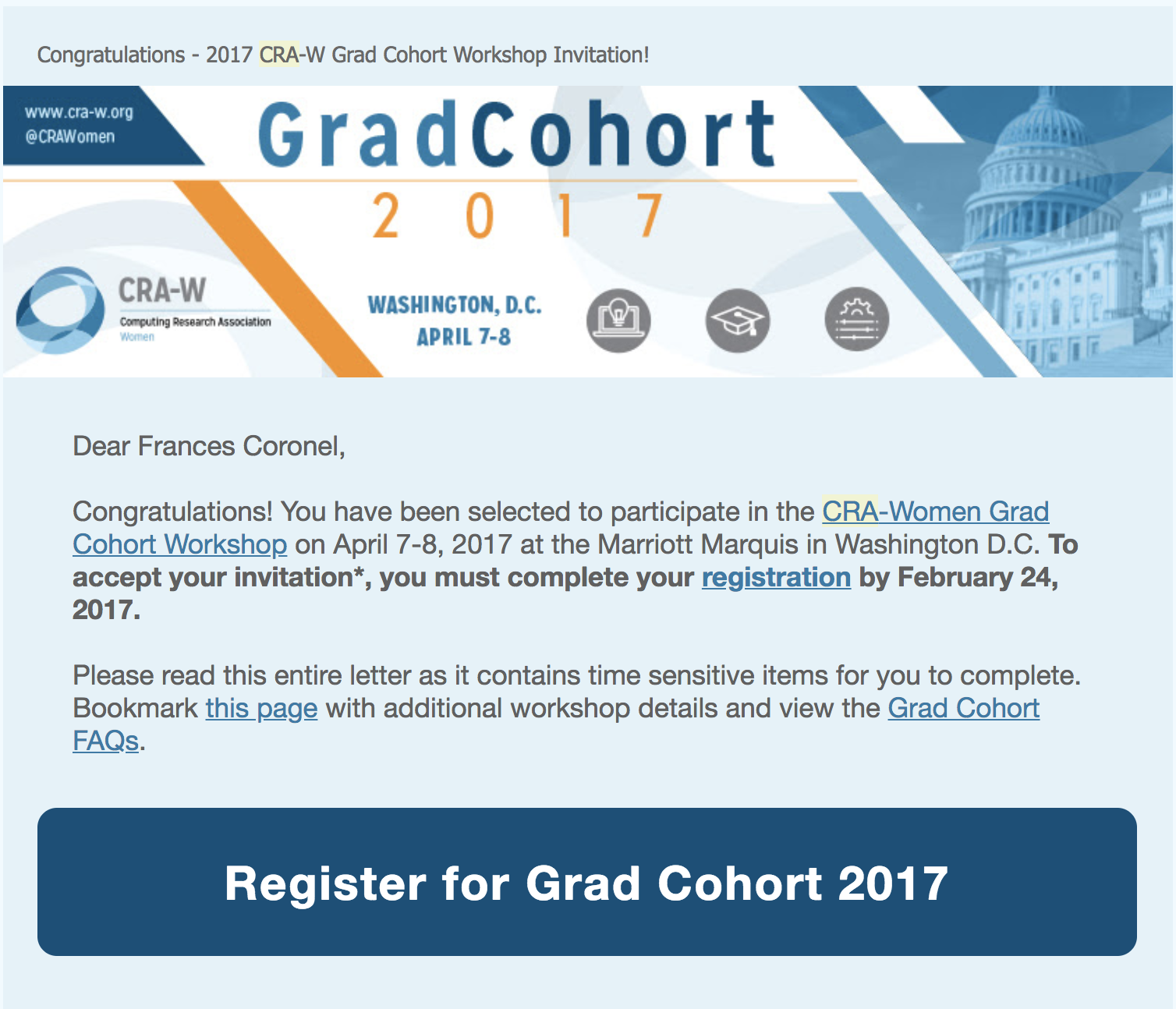 Selected to participate in the CRA-Women Grad Cohort Workshop on April 7-8, 2017 at the Marriott Marquis in Washington D.C