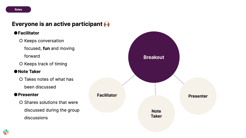 She made sure the entire team was actively contributing to the breakout sessions, assigning roles within each group Facilitator, Note Taker, Presenter.