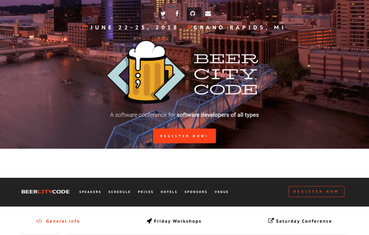 Beer City Code is an annual conference for software developers held in Grand Rapids, MI, also known as Beer City, USA. Software creators of all types are welcome, even those who donβt care for beer.