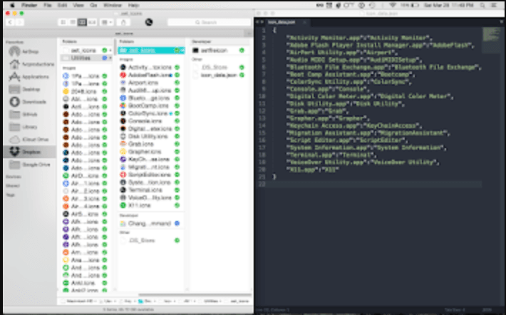 }It is formatted with the name of the app first in quotes followed by a semi-colon and then the name of the icns file. Edit this icon-data.json file to include your own apps or create it yourself using your favorite text-editor. Here is how the JSON file for the Utilities looks like.