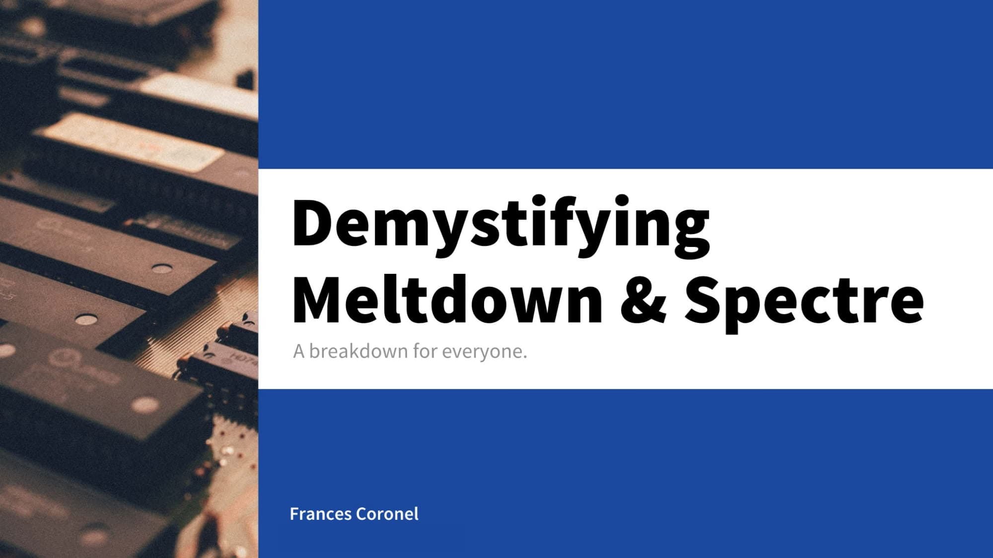 I had less about two days to come up with a 20-minute presentation that breaks down Meltdown & Spectre so I’m open to any feedback if you notice something off. 😊 Hey everyone! So I was tasked with “demystifying Meltdown & Spectre” for you all. Ideally, by the end of this presentation, you’ll have a better high-level understanding of how they both work.