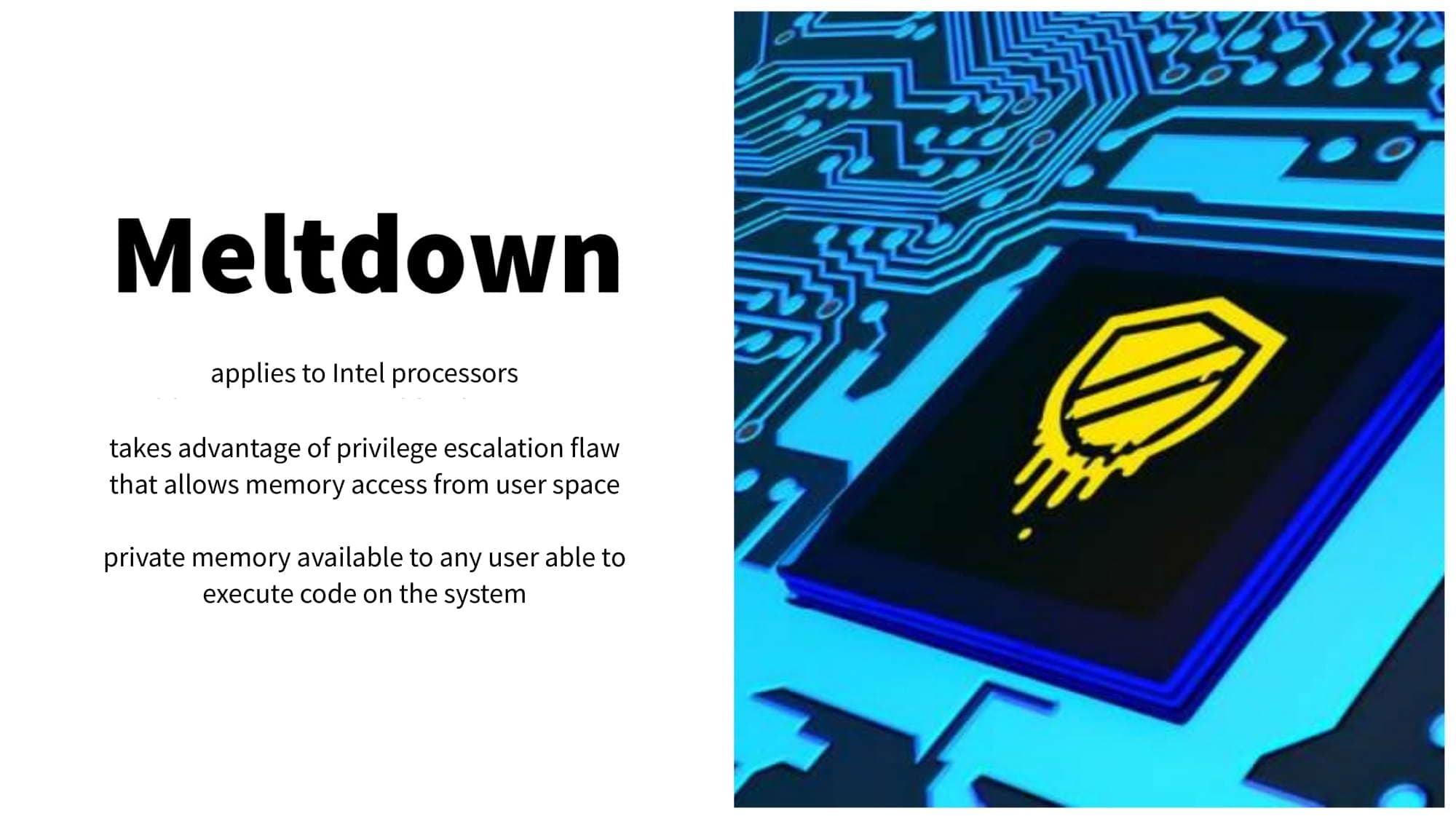 🔍 zoom Meltdown affects Intel processors and basically melts security boundaries which are normally enforced by the hardware. It does this by breaking down the mechanism that keeps applications from accessing memory.