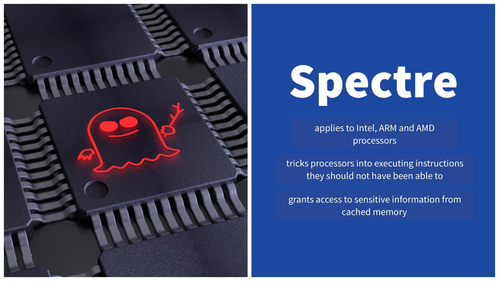🔍 zoom So Spectre is more dangerous because it is more crafty. Spectre gets its name from the root cause, which is called “Speculative Execution” which I described earlier. Spectre works by exploiting those speculations —mistraining the processor to make it predict wrongly and execute. So in essence, Spectre works by tricking programs into leaking their secretsAs it is not easy to fix, it will haunt us for quite some time. Hence, the ghostie.
