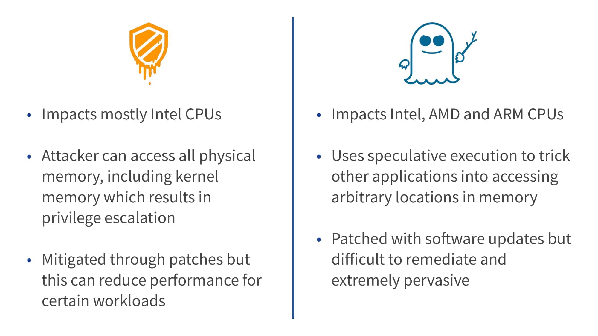 🔍 zoom The difference is that Meltdown takes advantage of a specific Intel privilege escalation issue to do this, while Spectre uses the combination of Speculative Execution and Branch Prediction. Both issues can be addressed with software patches, but this is more effective for Meltdown than Spectre.
