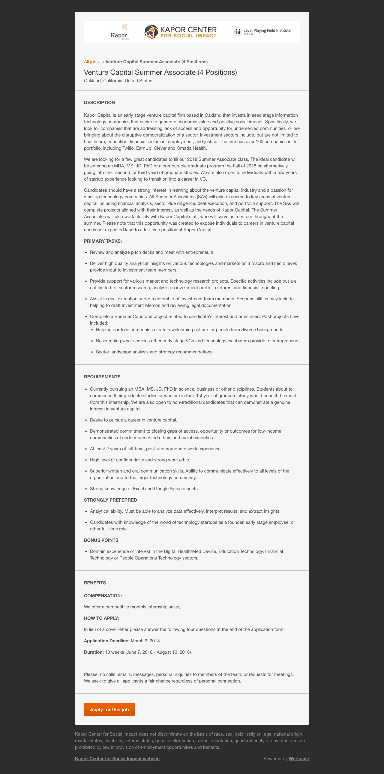 • Currently pursuing an MBA, MS, JD, PhD in science, business or other disciplines. Students about to commence their graduate studies or who are in their 1st year of graduate study would benefit the most from this internship. We are also open to non-traditional candidates that can demonstrate a genuine interest in venture capital. - Desire to pursue a career in venture capital. - Demonstrated commitment to closing gaps of access, opportunity or outcomes for low-income communities of underrepresented ethnic and racial minorities. - At least 2 years of full-time, post-undergraduate work experience. - High level of confidentiality and strong work ethic. - Superior written and oral communication skills. Ability to communicate effectively to all levels of the organization and to the larger technology community. - Strong knowledge of Excel and Google Spreadsheets. - Analytical ability. Must be able to analyze data effectively, interpret results, and extract insights. - Candidates with knowledge of the world of technology startups as a founder, early stage employee, or other full-time role. - Domain experience or interest in the Digital Health/Med Device, Education Technology, - Financial Technology or People Operations Technology sectors.