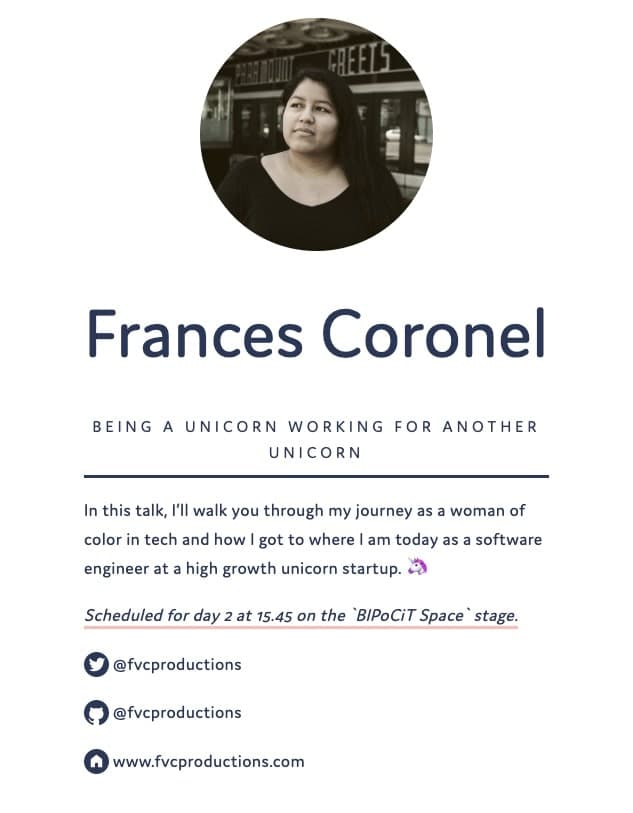 π https://2019.jsconf.eu/frances-coronel/being-a-unicorn-working-for-another-unicorn.html