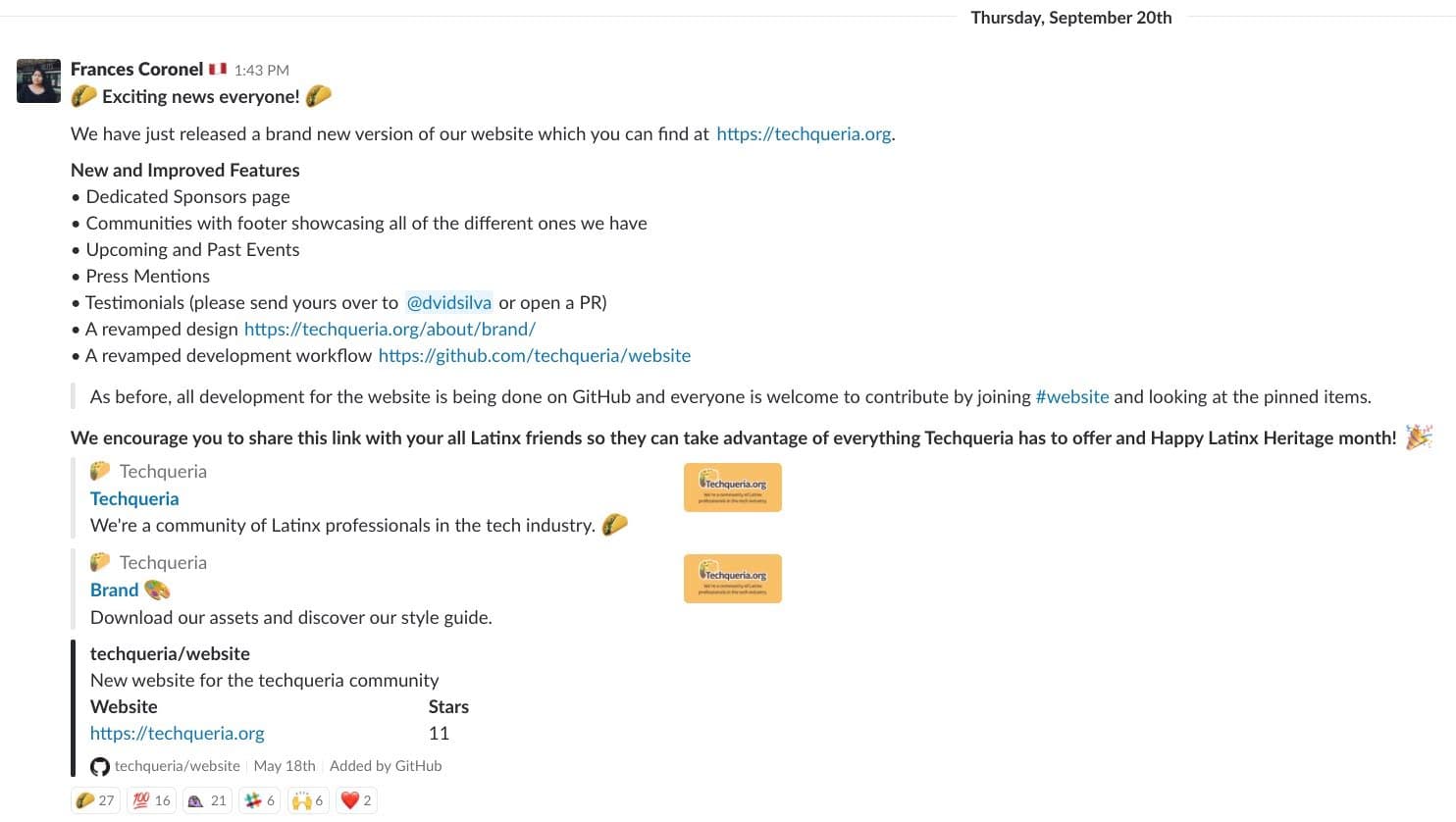 Helped spearhead creation of #website channel in Techqueria’s Slack for more collaborative development of the new website.