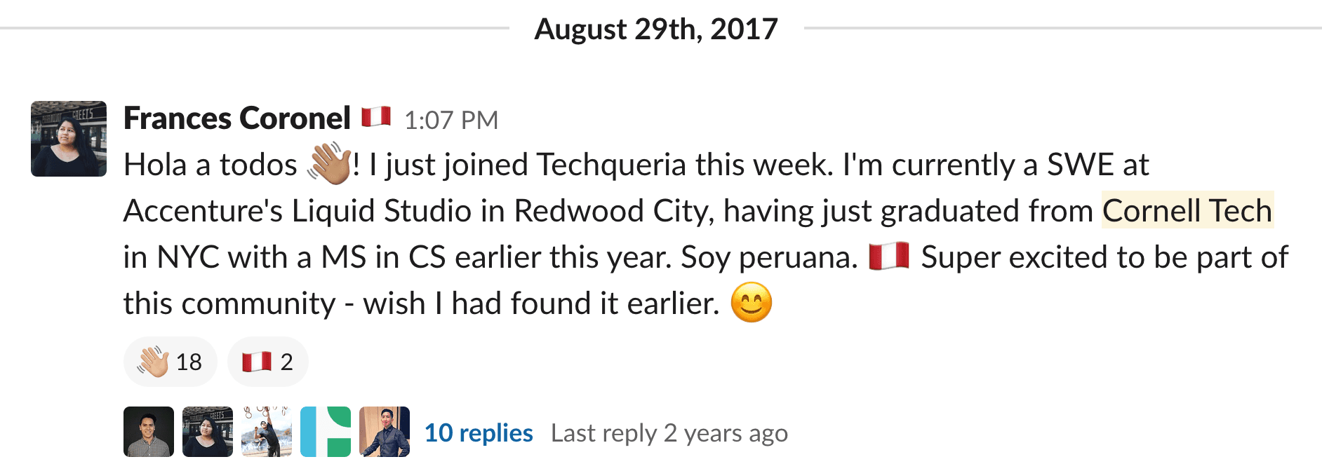 07/21/19 Hey Frances, thanks for organizing a lot of the things within Techqueria, and for creating this wonderful community! - Dennis Chang