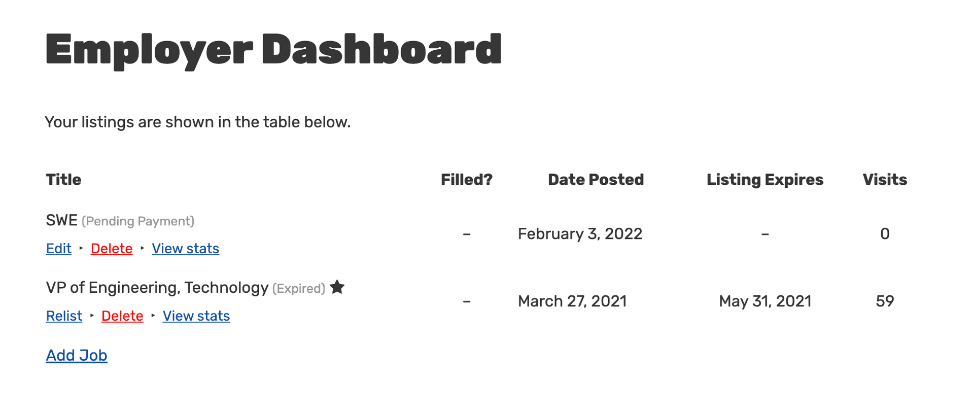 ability for employers to re-list expired jobs and view stats of jobs listed
