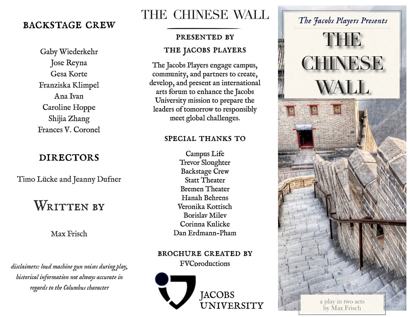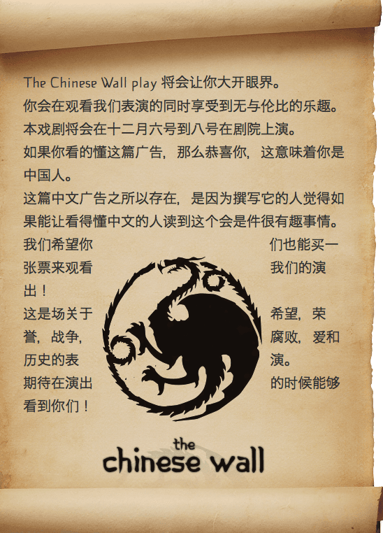 I was part of the backstage crew for 'The Chinese Wall' play at Jacobs University Bremen and was put in charge of marketing material and coordinating the specia