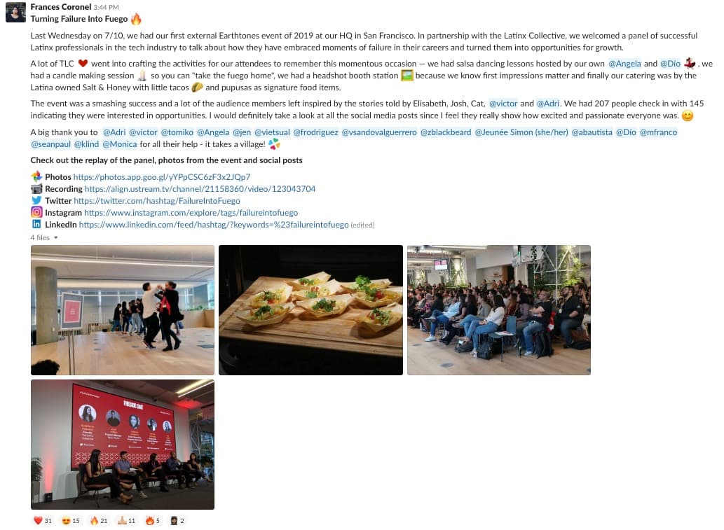 Luis Morales Hi Frances, It was a pleasure meeting you in-person last night at the Fuego meeting. I wanted to thank you and the team who put on the Turning Failure into Fuego meeting yesterday! It was such a wonderfully done event in every way… I came away with some great connections, and really inspired…. Thank you!! Jon Garcia Hi Frances, I wanted to connect because I did not get a chance to chat with you at the #failureintofuego event last night. It was my first tech networking event that I have attended since living in the Bay and I was truly inspired! Bianca Mancilla Hi Frances how are you doing? I was at the turning failure into fuego event and I enjoyed it very much. Maria Belen Giraudo Velez Hey Frances! Thank you so much for the follow up. Again, congratulations on a successful event Gabriela Catalina Reyes Hi Frances, I attended “Turning Failure into Fuego” and it was so inspiring to hear the panel’s stories. I was hoping we could connect! Carlos Rivera Thanks so much for organizing the event yesterday! I loved your intro where you said every detail was put together with love and care. It really showed Shashi Jain Hey, just wanted to say congrats again for crushing it with the event Gerry Franco A big 🌹 for Frances & Elisabeth and the rest of the organizers who made this event a reality! It was an incredible experience. Also 🌹 for the candle making. I loved it! Also really felt like there was a lot of time for networking that felt natural and organic. Josh Torres Hello Frances, I just wanted to thank you for the wesome event you put together yesterday. I got to interact with some amazing people and learned a lot from the speakers. 🌮 Daniel Morales ugh last night was so good. i manage a lot of events but there was so much 🔥 passion from the attendees, organizers and panel that it was one of my favorites we’ve hosted at slack. thank you all for being so on top of it and letting me in on the fun and fuego! Jen Reiber Thank you @Frances Coronel for making this event possible. It was such a beautiful experience to have so many Latinos come together and try to learn from one another. And the energy last night was AMAZING! Thank you everyone involved who made this happen. I was told FB did a similar event but this event was exponentially better! 🙌:skin-tone-3: Great teamwork, everyone :teamwork: Adriana Durante I just wanted to say this was an incredible event! 🔥 You all killed it. Victor Vazquez Great work @Frances Coronel, the whole ERG, and volunteers!!! Zinzi Blackbeard