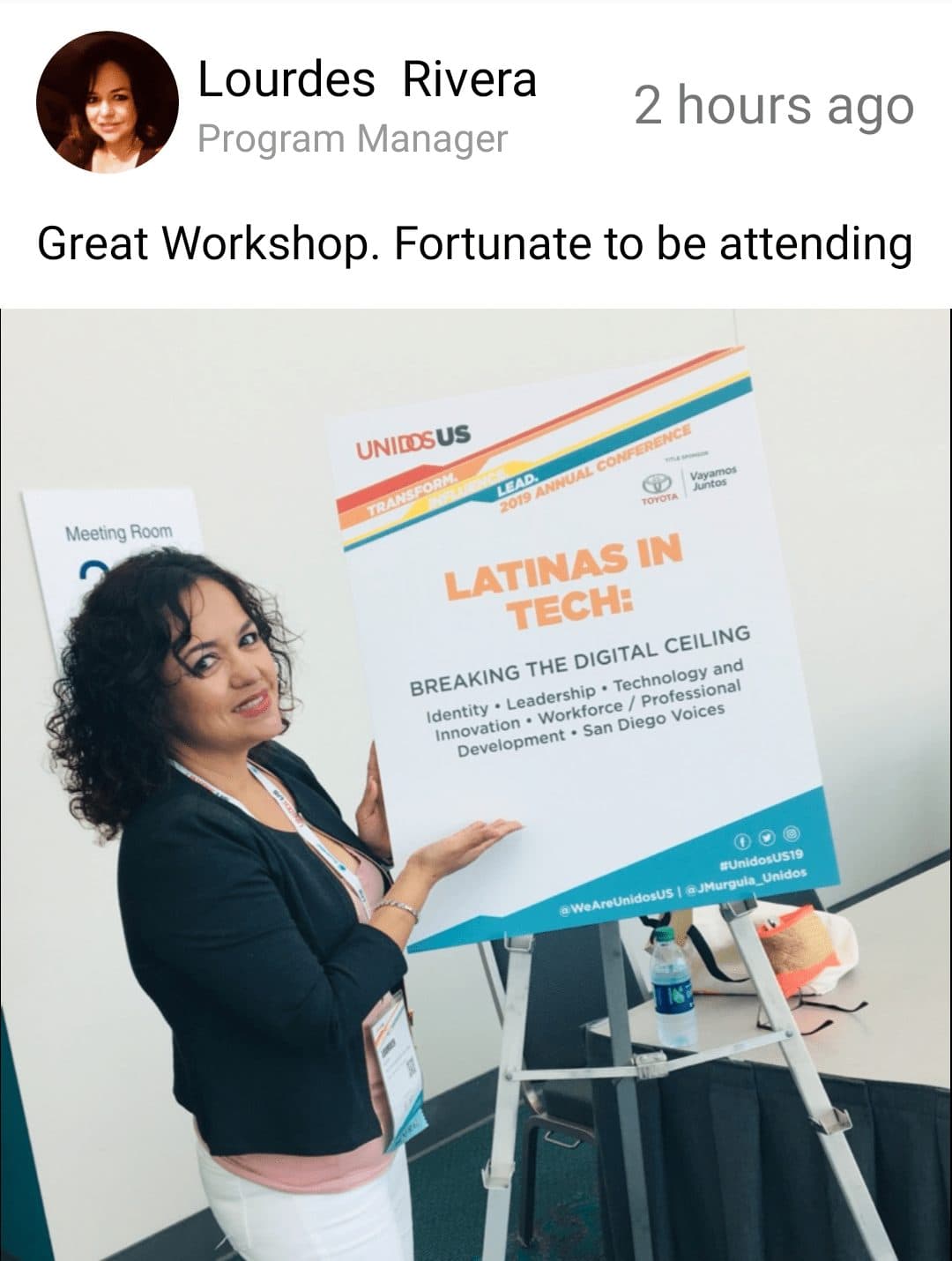 Sunday, August 4 at 9am β Worskhop Session β Latinas in Tech: Breaking the Digital CeilingThis conference is the largest gathering of its kind in the Hispanic community and serves as the meeting ground for thousands of community leaders, activists, and volunteers; elected and appointed officials; members of the corporate, philanthropic, and academic communities; college students; and youth. Latinas in Tech: Breaking the Digital Ceiling